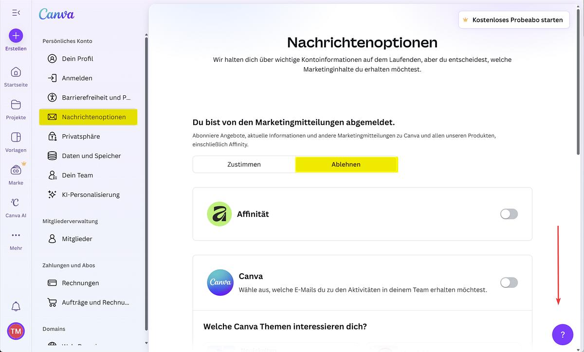 - Canva Nachrichtenoptionen 1: Marketingmitteilungen ablehnen.: Screenshot und Hervorhebungen: Thomas Michalak Berlin