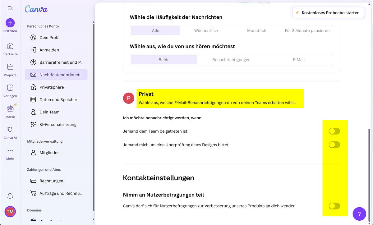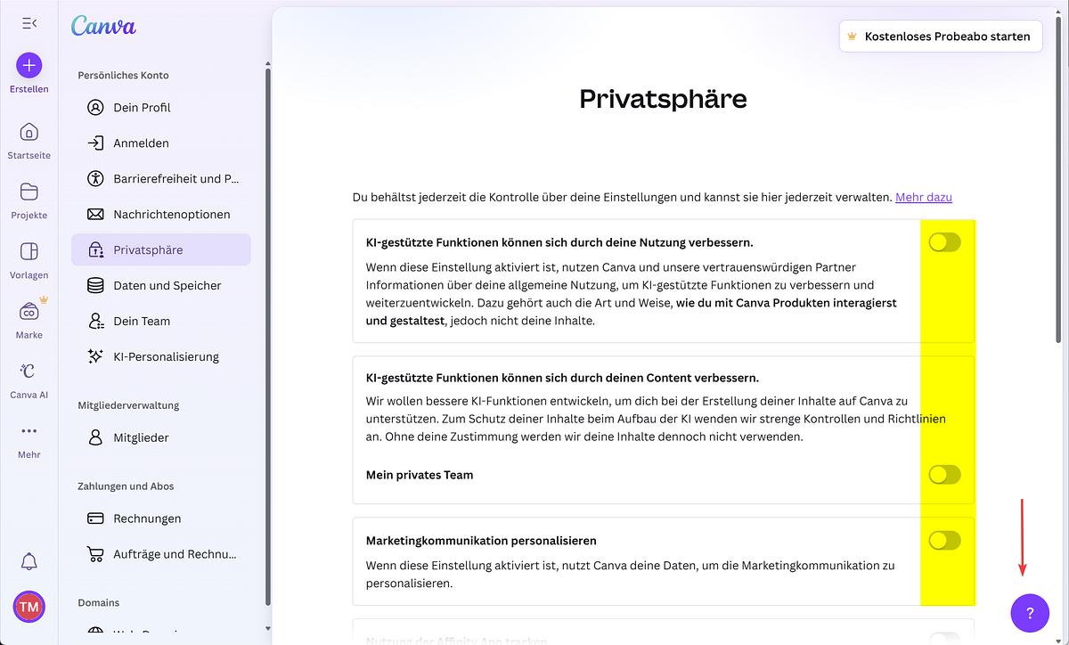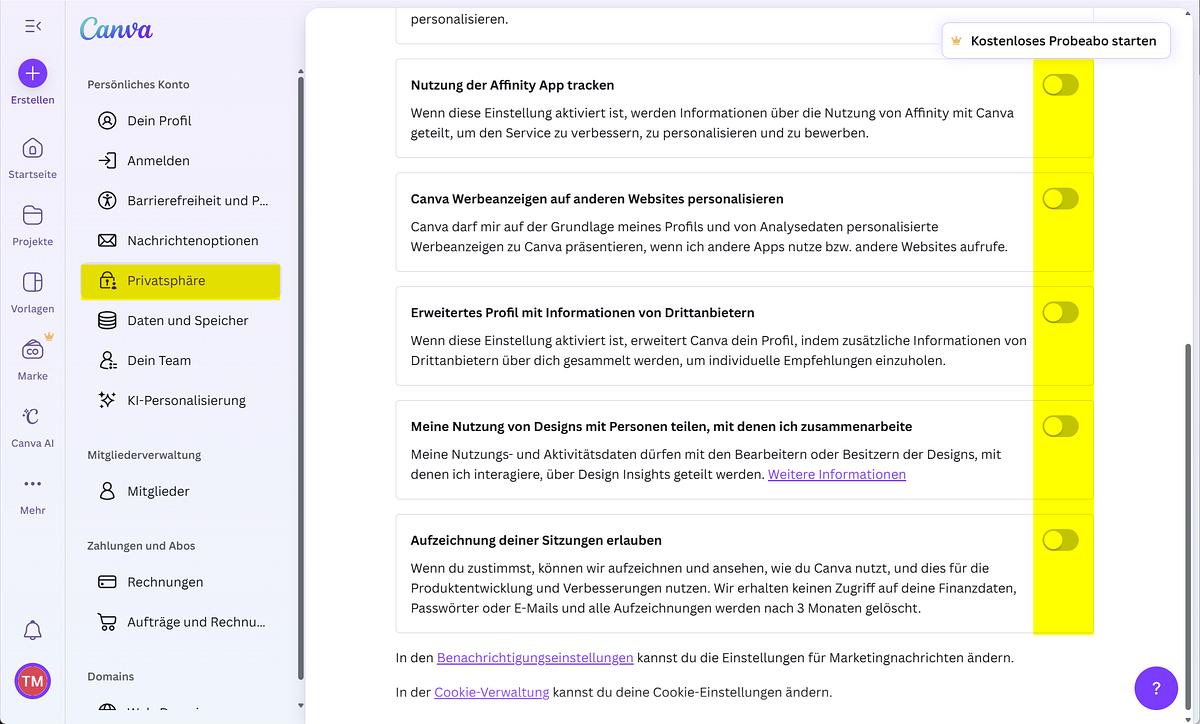- Canva Privatsphäre-Einstellungen 1: hier alles ausschalten!: Screenshot und Hervorhebungen: Thomas Michalak Berlin